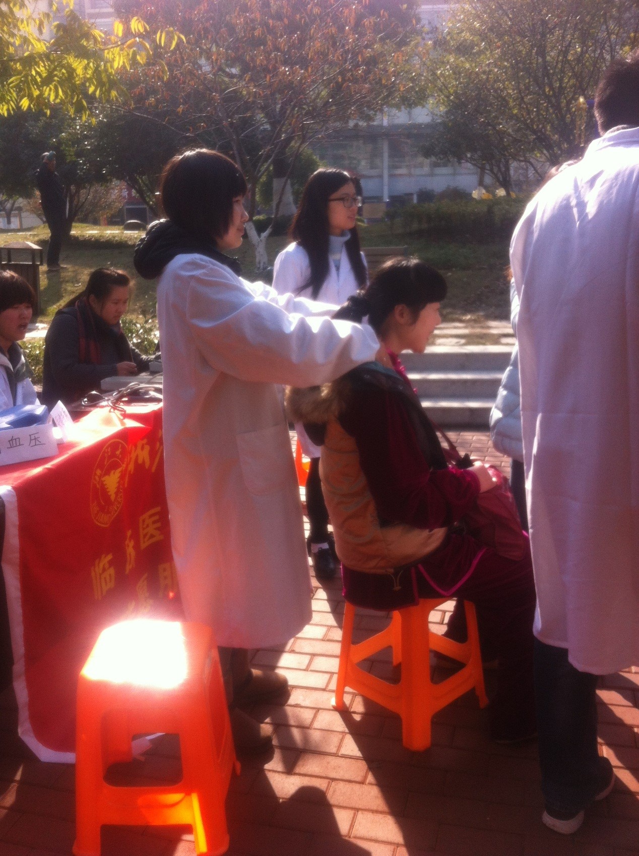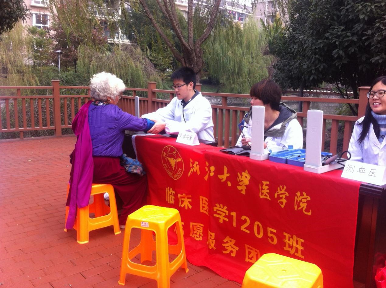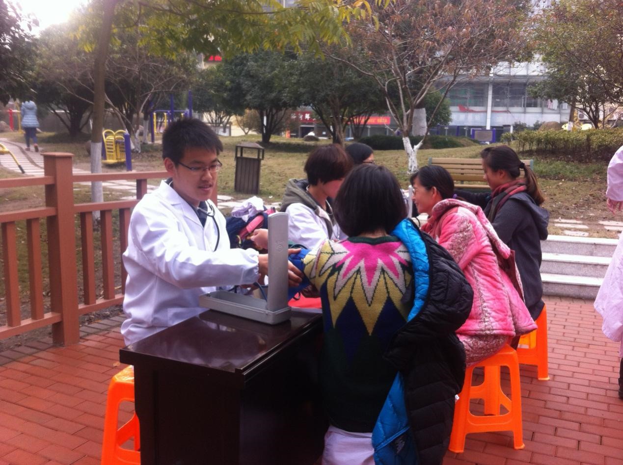 2014127日,我们临床1205班的8位同学开展了本学期第一次志愿服务活动。本次活动是我们班第一次组织志愿者活动,得到了同学们的积极参与。一些同学还因有事不能参加而十分遗憾。早上8时许,我们一行人乘坐公交车来到政苑社区,布置好场地,开始为周围来往的老人们测量血压以及保健按摩。