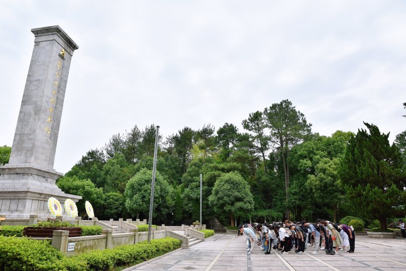 党员同志们首先瞻仰了四明山革命烈士纪念碑。纪念碑于1973年建造,高度约18.5米,碑上由郭沫若老先生题写“革命烈士永垂不朽”八个大字,长眠着1700余名革命先烈。同志们默哀三鞠躬,列队绕纪念碑一周,向革命烈士致敬。