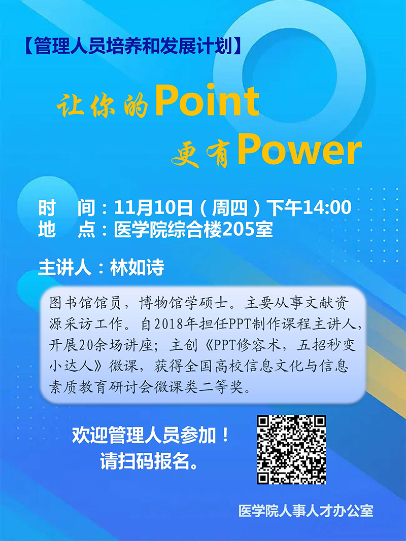 思享汇聚,“医”起成长!为加强管理人员培养和发展,夯实管理人员业务能力,提高PPT设计与制作水平,学院拟举办ppt制作技能提升讲座,具体安排如下: