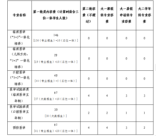 2.医学试验班类各专业的遴选录取:按志愿优先原则,(1)如果第一专业志愿申请人数≤专业容量,则申请学生全部确认进入该专业;(2)如果第一专业志愿申请人数>专业容量,则该专业第一轮类内容量的前60%按高考相对成绩排名直接接收,其余学生进行面试遴选,面试着重考察学生综合素质,并根据综合评分从高到低按照专业志愿确认。
